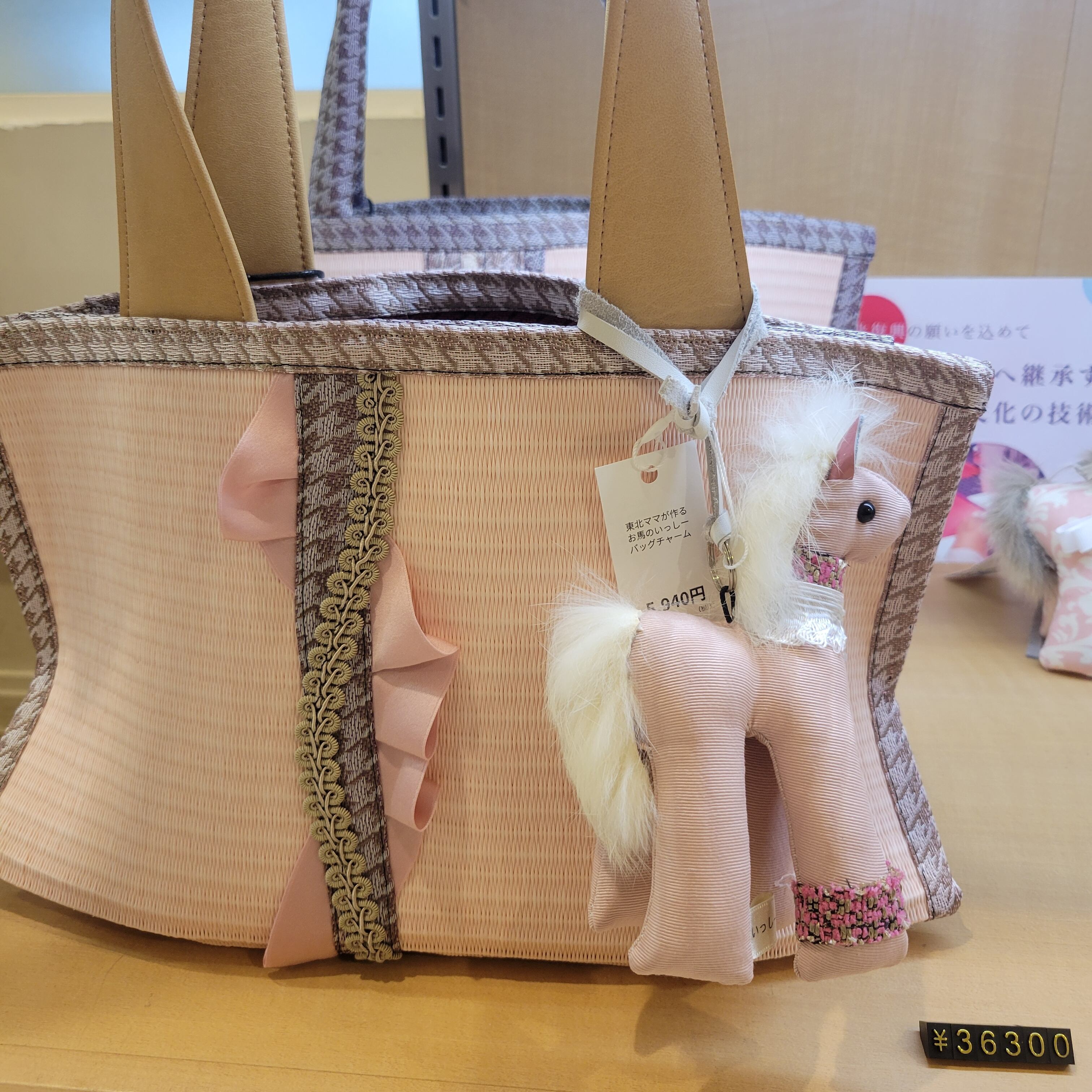 画像五枚目は横幅約30cmのバッグに本チャームを付けた際の大きさ比較となります。